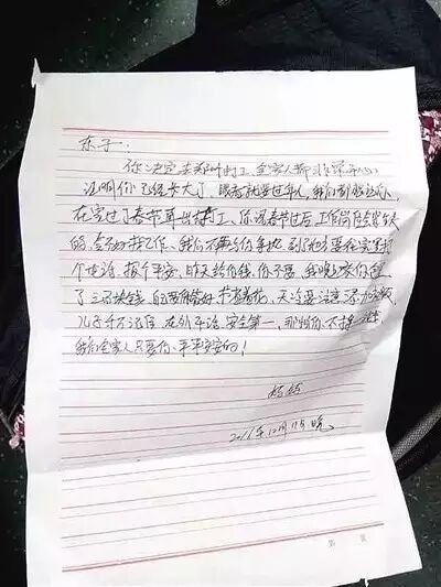 拉开拉链,一张信纸出现在眼前,打开后看到是母亲写给儿子的信,嘱咐他在外打工要注意安全,要多穿衣服防寒保暖,包里还塞了300元零花钱。