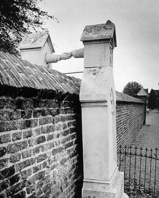 1880年,在相伴42年后,女人的丈夫先她而去。因为宗教不同,丈夫死后要葬入新教的公墓,而女人死后要葬在天主教的公墓。为了和她的丈夫在一起,女士要求她的坟墓在两座墓地之间的砖墙旁边,挨着她的丈夫。她在两座墓石之间修建了石手,连通两座墓石,这样他们就可以永远拥抱在一起。