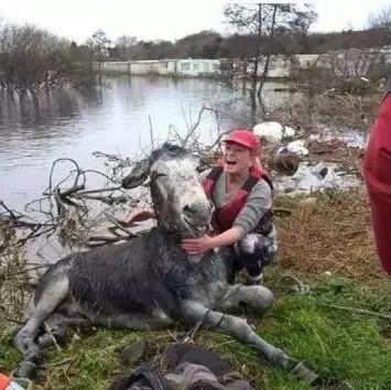 一只驴子在爱尔兰一场洪水中获救,知道自己安全后,在救援队员的怀里开心地笑了。