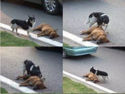 听过狗狗哀鸣的声音多么凄惨吗? 一只小狗被过路汽车撞死,同伴不停拍打想唤醒它,但怎么都唤不醒,就呜呜地悲鸣。