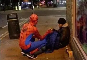 匿名的蜘蛛侠总会在夜里给饥寒交迫的流浪汉送食物。没有超能力,也可以做英雄。