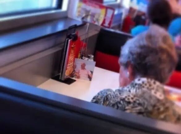 在肯德基门口,一位年老的乞丐进去为老伴买了支甜筒,然后坐在门口看着她吃。作为消费者,他们有权利坐在里面吃,但他们却因为自己的身份悄悄退到门外。工作不分贵贱,在真爱面前,我们一样卑微。