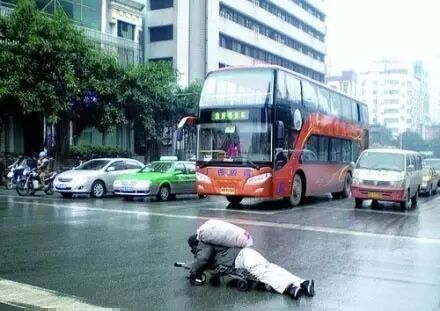 一名下肢瘫痪的残疾人趴在自制的代步车上过马路,因为行动缓慢走到斑马线三分之一的时候两侧的绿灯就亮了,然而此时路口所有的车辆都安静地等在原地,直到他安全通过路口才依次驶过。 25