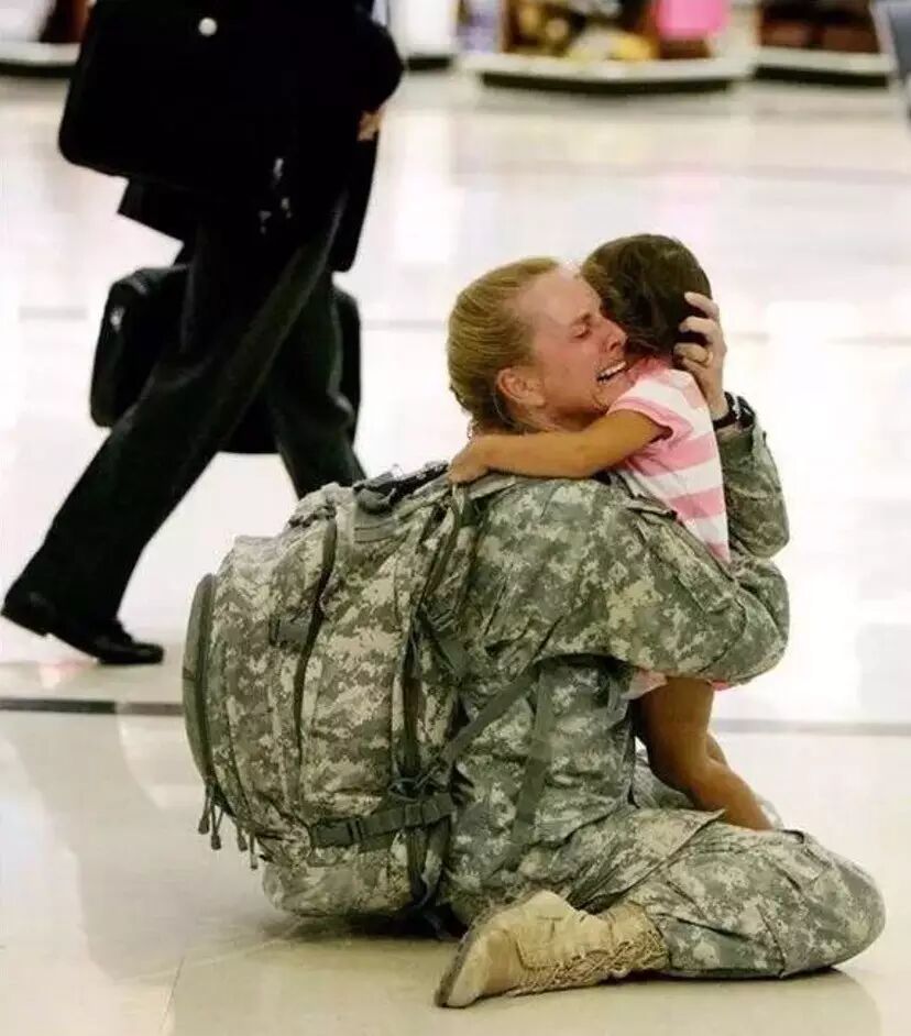 从伊拉克服役归来的女兵和自己的女儿紧紧拥抱在一起。我们并没有活在和平年代,我们只是活在一个和平的国家。