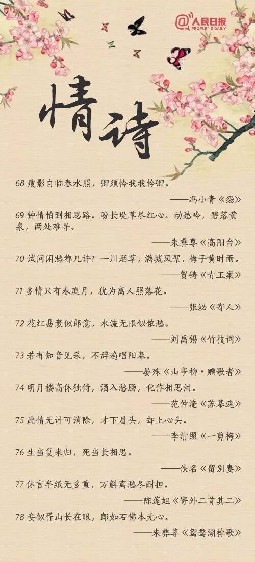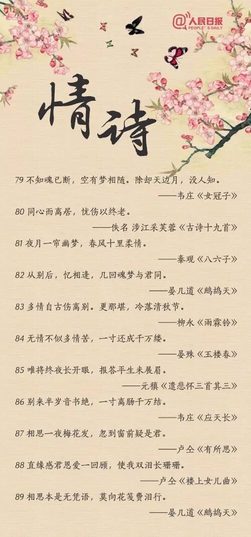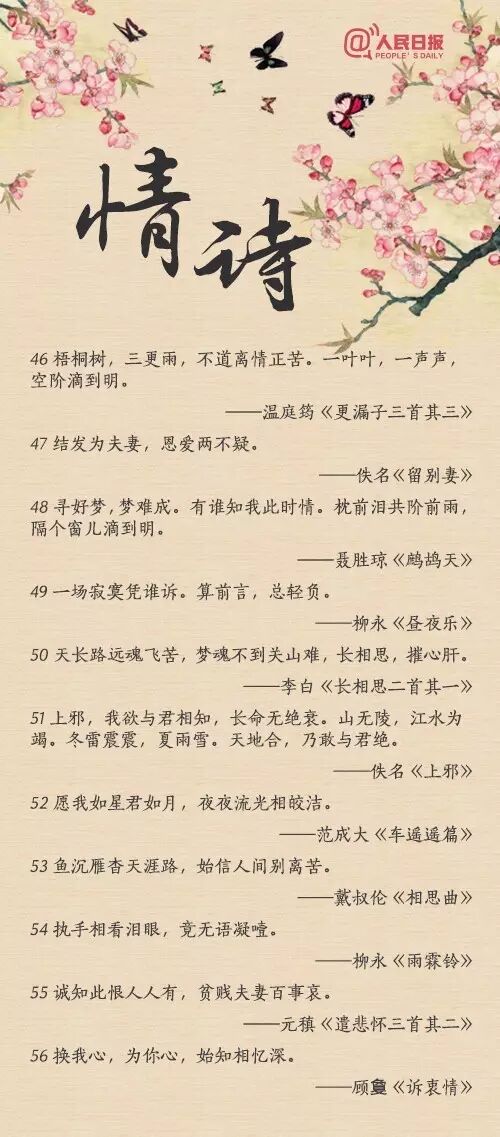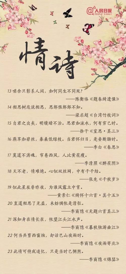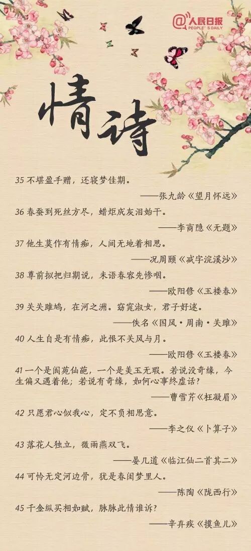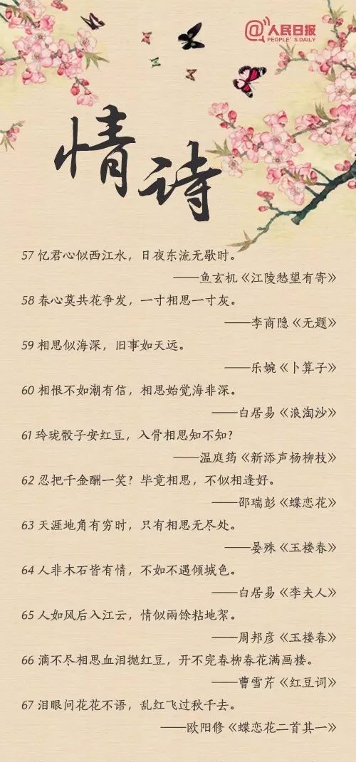 “似此星辰非昨夜,为谁风露立中宵”;“玲珑骰子安红豆,入骨相思知不知”;“天不老,情难绝。心似双丝网,中有千千结”......从相遇到相知,从相恋到相守,情诗或有千百句,却唯有一人,让你懂得了诗中的美。转给TA!