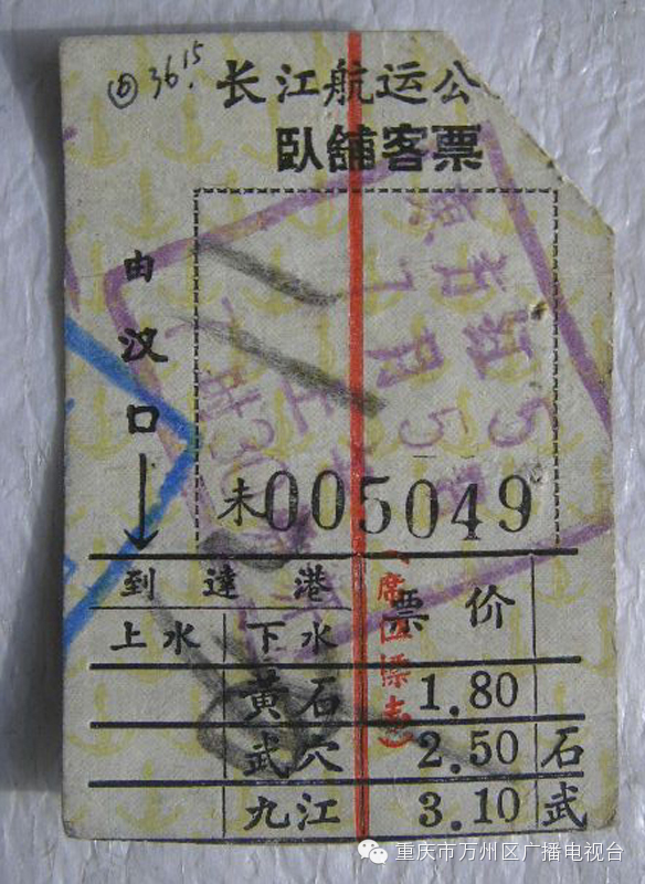 船票的正面,一般是普通淡黄底,黄色铁锚暗纹。最上方一般印着“最高指示”:“要斗私,批修。”(后来的船票上面不再印“最高指示”)然后印有出发港:“由××→”,再下方分四列:靠左边两列印有上下水所到达港口的名称,第三列是船票价格,第四列是错位的旅客到达港简称(方便售票公司核对所售票据的目的港口)。最下面的港口名称,即是旅客目的港。如果旅客买的是舱位票,则舱位等级用大红色的竖条纹标明:一条红纹标志一等客舱;两条红纹标志二等客舱……最多是四条红纹,即标志四等客舱。五等舱一般是统舱,船票上没有红纹。客舱等级越低,标志客舱条件越好,票价越高。船票必须加盖长江航运公司的轮船印章才有效。所以一看船票,就知道旅客乘坐的是哪一艘客轮,开船时间及航次。