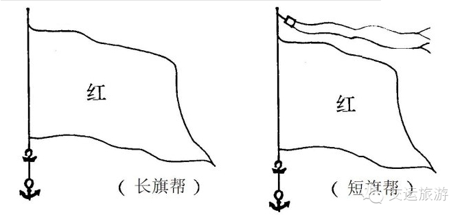 船顶旗标:镶红色鸡冠形的正方形红旗,上加二根青色飘带。